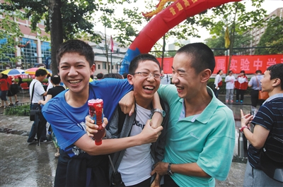 去年6月8日,高考结束后,在北师大附属实验中学参加高考的考生们开心地搂在一起。资料图片/新京报记者 彭子洋 摄
