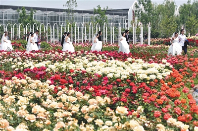 新人们携手游览月季花海。5月20日上午,2016世界月季洲际大会举办期间,来自6个国家的28对新人参加集体婚礼。