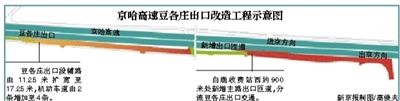 记者在豆各庄出口看到,从京哈高速主路上下高速的出口已经由原来的一车道变成两车道,承接主路车辆的辅路也由原来的两车道变为四车道。