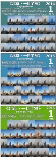 北京市民邹毅从2013年开始每天坚持在同一时间、同一地点、同一角度,拍摄一张照片,制成北京空气质量视觉日记。照片显示2016年1月比2014年1月蓝天数多10个,比2015年多8个。