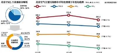 从去年全年情况来看,与2013年相比,2015年北京市空气中的二氧化硫、二氧化氮、PM10和PM2.5浓度分别下降49.1%、10.7%、6.1%和9.9%。