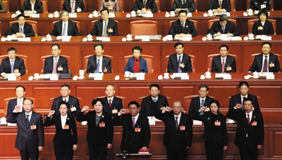 昨日上午的全体会议公布选举结果后,除敬大力外的7名当选者现场宣誓就职。这是今年元旦《北京市国家工作人员宪法宣誓组织办法》正式实施后,首次进行的官员宣誓就职。