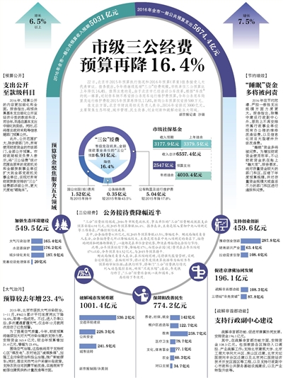 在支出方面,北京市财政局相关负责人表示,2016年安排近3000亿元,主要聚焦生态环境、城市管理、民生改善、创业创新和疏解功能五大领域。