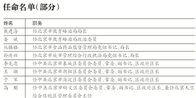昨日公布的任免名单中,还任命了市教育矫治局、市药监局、市城管执法局的一把手。戴建海任市教育矫治局局长,娄斌任市教育矫治局政治委员,丛骆骆任市食品药品监督管理局党组书记、局长,孙连辉任市城市管理综合行政执法局党组书记、局长。