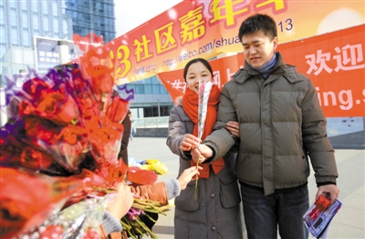 昨日,搜房网社区论坛和双井13社区举办情人节前送玫瑰花和义卖巧克力活动。本报记者 王贵彬 摄