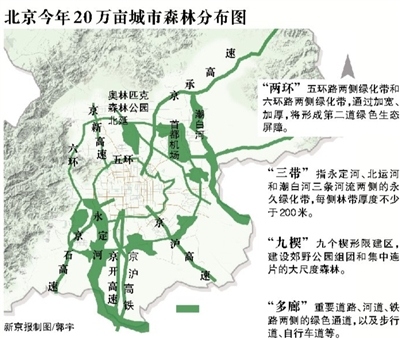 今年20万亩城市森林将按照相对集中连片、成带连网的原则,主要安排在六环路两侧、城乡接合部50个重点村拆迁腾退地区,以及重点河流道路两侧和荒滩荒地、航空走廊和机场周边、南水北调干线和配套管网范围等地区实施造林绿化。重点搞好首都机场周边和航空走廊,北中轴奥林匹克森林公园向北延伸至六环路,京沪高速(原京津塘高速)以及永定河两侧绿化,构建大规模的带状及区域生态体系。
