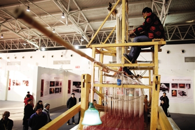 昨日,两位技师在展示蜀锦织造技艺。本报记者 韩萌 摄