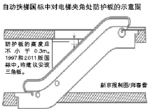 北京市质监局有关负责人表示,在新版国标完成过渡期后,北京所有的自动扶梯将要求由目前的悬挂式防碰挡板更换成固定挡板。