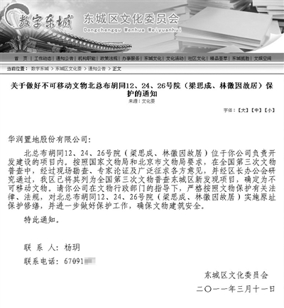 这份通知发布于2011年3月11日,题为《关于做好不可移动文物北总布胡同12、24、26号院(梁思成、林徽因故居)保护的通知》,通知来自东城区文化委,通知对象为华润置地股份有限公司。