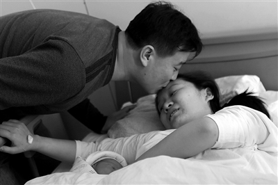 23日,北京同仁医院亦庄分院,罗卫征亲吻生下龙宝宝的妻子。本版图片(除署名外)/本报记者 吴江 摄