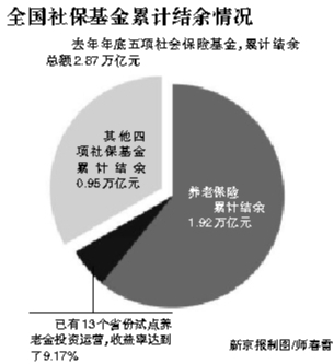 尽管基金数额大,但养老保险的支付压力也是最大的。按照现行规定,我国养老基金仍然只能存银行或者买国债。不过,全国已有13个省份试点做实养老金个人账户。具体为辽宁、吉林、黑龙江、天津、山西、上海、江苏、浙江、山东、河南、湖北、湖南、新疆等13个省份。