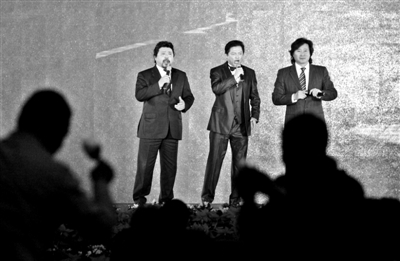 昨日,北京饭店,歌唱家戴玉强(右)、莫华伦(中)、魏松(左)正在舞台上演唱。当天,由北京市委、市政府主办的2012年首都文化界新春招待会在北京饭店举行。400余位知名艺术家和领导出席了招待会,共同探讨首都文化发展,共迎新春佳节。