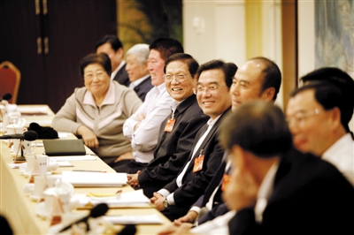 昨日下午,各代表团审议政府工作报告。北京市委书记刘淇微笑着倾听其他代表的意见。本报记者 赵亢 摄