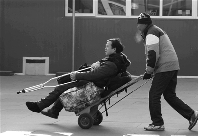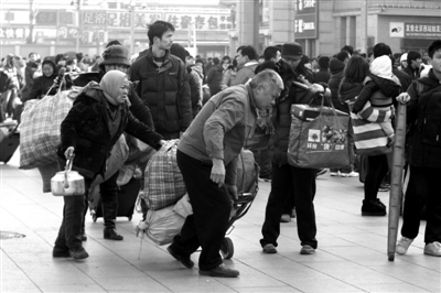 北京站,返乡者有挑扁担的,还有拎着烧水壶的。
