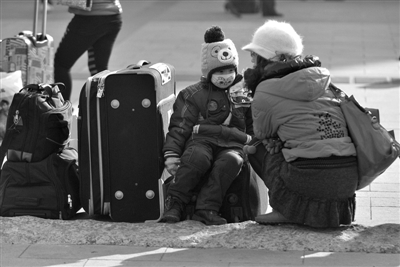 北京站,候车的小旅客坐在行李箱上休息。