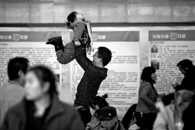 昨日,北京西站,候车室内玩耍的父女。当天,北京西站发送旅客19.2万人。