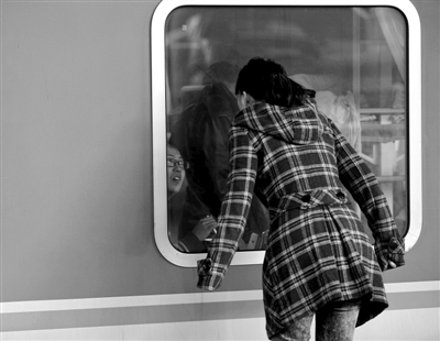 北京西站,一名女子隔着车窗和朋友交流。