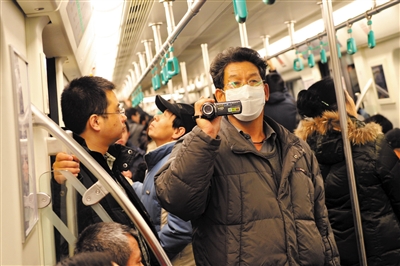 昨日下午,8号线列车上,一位大爷用摄像机记录着新车的一切。