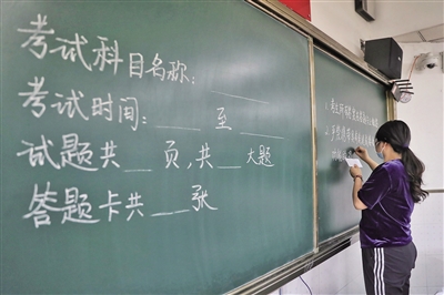昨日,北京市第十八中学(方庄校区)高考考场内,老师正在黑板上写高考考试科目提示及考场注意事项。 A04-A05版摄影/新京报记者 王飞
