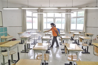 昨日,北京市第十八中学(方庄校区),工作人员正在给高考考场进行消毒。
