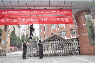昨日,北京市第十八中学(方庄校区),工作人员正在高考考场外布置横幅。