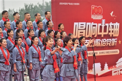 昨日,东城区“唱响中轴——唱支山歌给党听”群众大合唱活动第一篇章“开创新天地”在永定门广场拉开帷幕。东城区文化馆华风合唱团和钟声合唱团分别演唱了《南湖的船,党的摇篮》《延安颂》《四渡赤水出奇兵》和《毛委员和我们在一起》等歌曲。此次活动共4个篇章,分为“开创新天地”“建设新世界”“创造新辉煌”和“走进新时代”。其余三场活动将于6月5日、6日、7日分别在前门大街、钟鼓楼广场和天安门国旗班训练场西侧举行。 新京报记者 王贵彬 李玉坤 摄影报道