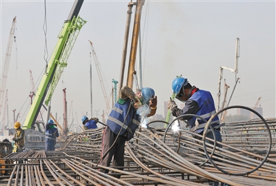 昨日,东坝车辆段施工现场,工人们正在焊接钢筋。 本版摄影/新京报记者 王飞
