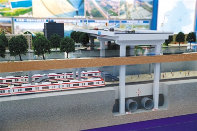 西四环暗涵工程模型,装着南水的管道从五棵松地铁站下“钻”过。