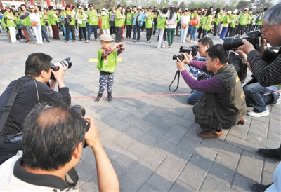 昨日,北京园博园,一名小男孩拿着相机和一些专业摄影师们对拍。2013北京国际长走大会当天在园博园举行,近万名市民参加。拍者 魏尧