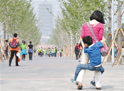 一名男孩走累了想让妈妈背他。新京报记者 王嘉宁 摄