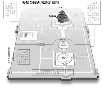 据曲禄政介绍,天坛公园内坛墙修缮工程目前只包括东、西、北三面坛墙,共3100米长,而长达1000米的南坛墙目前没有具体的修缮计划。