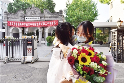 昨日下午,北京市第二中学考点,走出考场的考生(右)收到闺蜜送来的鲜花。