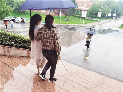 5月19日,南京特殊教育师范学院,周文晴(左)和邬逸帆相互搀扶着走在雨中。新京报记者 苑苏文 摄