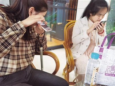 5月19日,邬逸帆(左)和周文晴(右)在读屏系统的辅助下发微信。新京报记者 苑苏文 摄