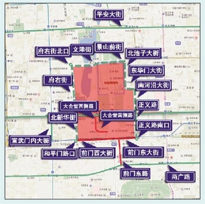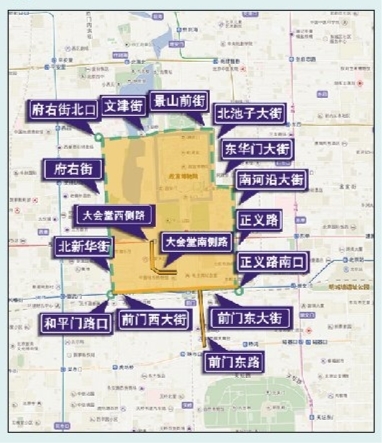 由府右街北口(不含)向南,经府右街(不含)、北新华街(不含)至和平门路口(不含)向东,经前门西大街、前门东大街至正义路南口(不含)向北,经正义路(不含)、南河沿大街(不含)、东华门大街(不含)、北池子大街(不含)向西,经景山前街(不含)、文津街(不含)至府右街北口(不含)以内区域(以上区域不含长安街),人民大会堂西侧路、人民大会堂南侧路、前门东路,除持有演练活动专用证件的车辆和人员外,禁止其他车辆和行人通行。