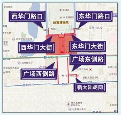 天安门前金水桥以北故宫午门以南地区,西华门路口(不含)经西华门大街、西筒子河路、东筒子河路、东华门大街至东华门路口(不含)、天安门广场东侧路、天安门广场西侧路、新大陆胡同,除持有演练活动专用证件的车辆和人员外,禁止其他车辆和行人通行,机动车禁止停放。