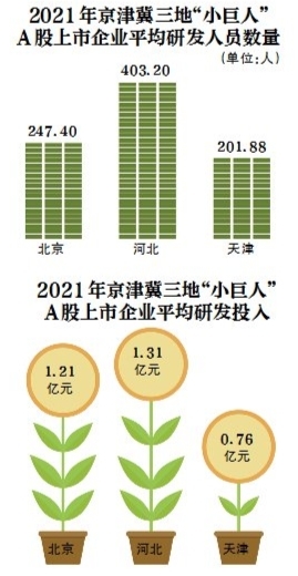 京津冀三地中,河北的“小巨人”企业研发人员平均为403.20人,北京为247.40人,天津为201.88人。从2021年研发投入来看,河北更是以平均1.31亿元高居京津冀三地之首,中位数为0.32亿元;北京以平均1.21亿元位居第二,中位数平均为1.05亿元;天津仅为0.76亿元,中位数平均为0.65亿元。