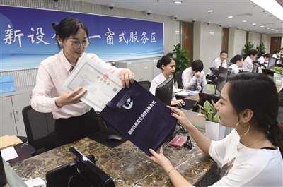 2019年5月14日,朝阳区政务服务管理局“新设企业一窗式服务区”前,工作人员向申请人发放营业执照、公章和“政务服务包”。新京报记者 吴宁 摄