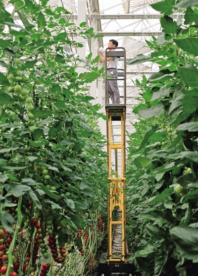现代化大棚里,工作人员进行高空农业操作。受访者供图