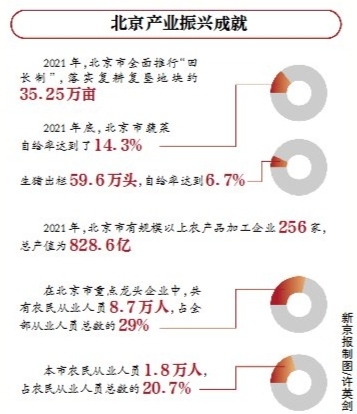同时,北京的蔬菜、生猪生产也快速恢复,到2021年底,按照《北京市“十四五”时期乡村振兴战略实施规划》中关于产业兴旺的六个指标,全市蔬菜自给率达到了14.3%、一年之内就完成了“十四五”任务目标的43%,生猪出栏59.6万头,自给率达到6.7%,完成规划任务目标的58.7%。