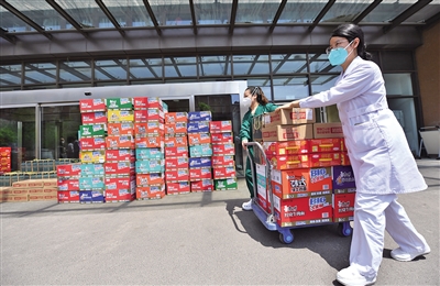 5月12日,垂杨柳医院,捐赠物资分发到一线医务工作者手中。