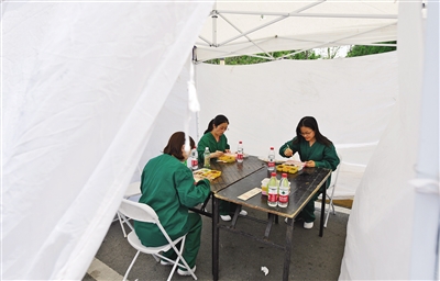 5月12日,朝阳区惠力西路核酸检测点,垂杨柳医院医务工作者在休息区吃简易午餐。