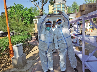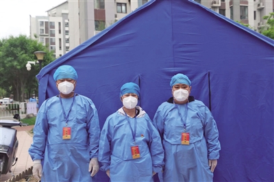 在金盏嘉园B区,老党员王雪梅和女儿刘欣月、女婿孙磊,一家三口也当上了志愿者。王雪梅告诉记者:“头天晚上,我就和孩子们商量,小区管控了,你们也没法去工作,要不咱去当志愿者,为社区出点儿力。”王雪梅的提议得到了女儿和女婿的支持。5月3日早上6点,一家三口就出了门,到社区领上蓝色防护服,正式“上岗”了。
