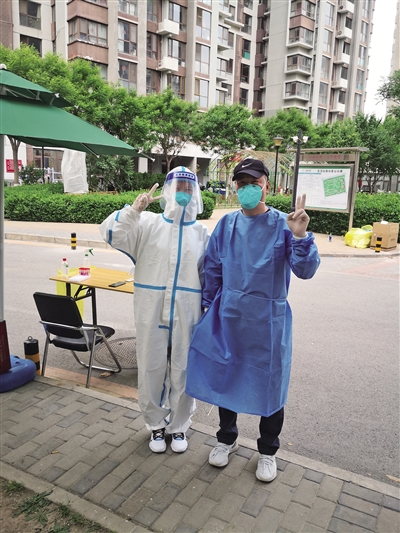 在大屯街道安慧北里安园社区居委会院外的核酸检测点,也有两名60多岁的志愿者,他们既是并肩抗疫的战友,又是相濡以沫的夫妻。