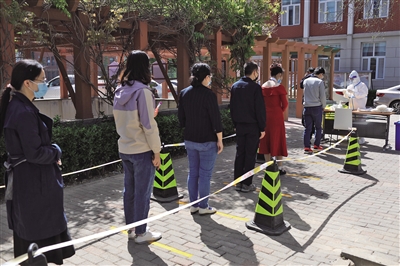 海淀区中关村街道以网格为单位统筹辖区内各社区、楼宇、院所、门店等,组织人员核酸检测。4月25日23时,街道与医院、下沉干部、辖区单位的各项准备对接工作就绪,防护服、口罩、手机等设备物资均发放到位。