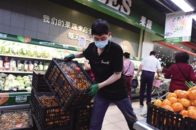 4月25日,朝阳区永辉超市垡头店,工作人员正在水果区域上货。 新京报记者 王飞 摄