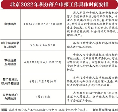 一是申报阶段(4月14日8时至5月13日20时,共计30个自然日)。二是部门审核结果汇总阶段(5月14日至6月2日,共计20个自然日)。三是审核结果查询阶段(6月3日8时至6月10日20时,共计8个自然日)。四是部门复核及积分排名阶段(6月11日至7月10日,共计30个自然日)。五是公示和落户办理阶段(7月11日起,公示8个自然日,经公示取得落户资格的申请人可办理落户手续)。2022年,北京市积分落户规模将继续保持稳定,为6000人,并实行同分同落。