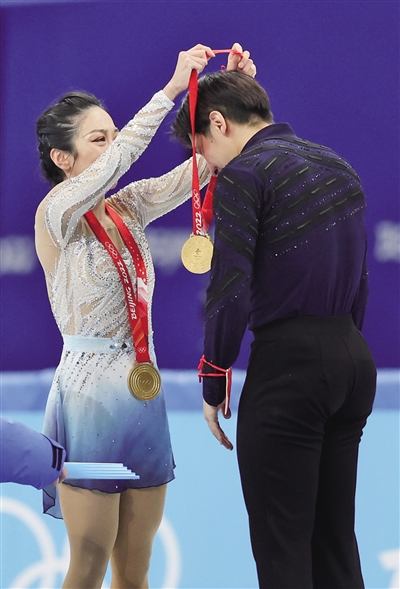 2月19日,隋文静(左)在奖牌颁发仪式上为韩聪戴上金牌。新华社记者 曹灿 摄