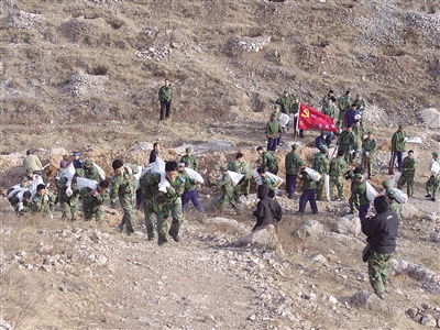 40里北山,部队官兵背土上山,支援植树造林。受访者供图