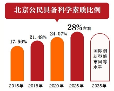 “十四五”时期,北京重点开展青少年、农民、工人、老年人、公务员等五大重点人群科学素质提升行动。到2025年,北京市公民具备科学素质的比例达到28%左右,到2035年,北京市公民具备科学素质的比例达到国际创新型城市同等水平。中国公民科学素质抽样调查采用国际通行指标,包括公民对科学的理解、公民的科技信息来源、公民对科学技术的态度等内容。
